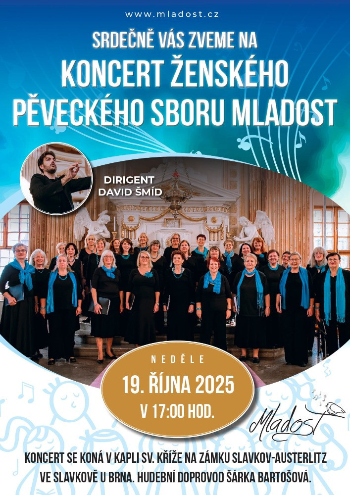 Zveme Vás do krásného prostředí kaple sv. Kříže na zámku Slavkov – Austerlitz, kde se v neděli 19. října 2025 od 17:00 hodin uskuteční koncert ženského pěveckého sboru Mladost pod vedením dirigenta Davida Šmída.